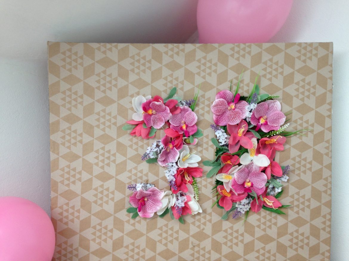 Pentru a realiza panoul am folosit o cutie de carton plată pe care am învelit-o în hârtie de împachetat. Am desenat cifra dorită (2 x 12/25 cm) și am lipit florile și frunzele artificiale cu ajutorul unui pistol de lipit. Am fost mulțumită de rezultat, dar, cifra ar fi fost mai clară dacă aș fi făcut-o puțin mai mare (voi știi data viitoare).
